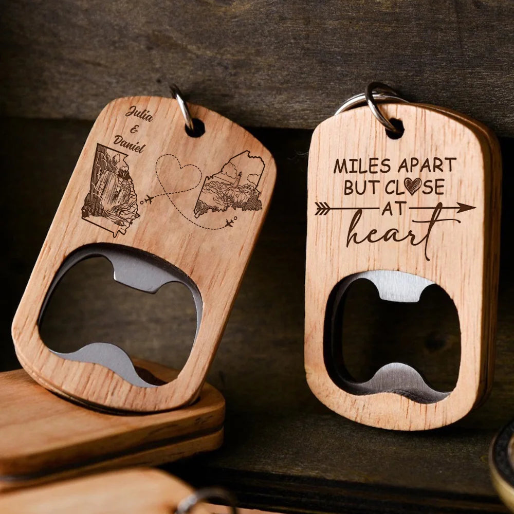 Miles Apart But Close At Heart - Personalized Wooden Bottle Opener Keychain KC12